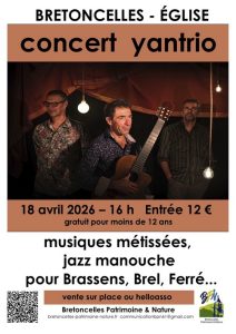à 16h dans l’église de Bretoncelles à ce concert avec Yantrio qui se compose de Laurent Zeller au violon, Alexandre Voisin à la contrebasse et Yann beaujouan guitare et voix.